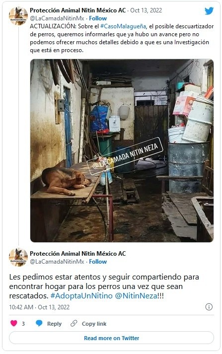 En un domicilio de la colonia Benito Juárez, elementos de la Fiscalía General de Justicia del Estado de México (FGJEM), Procuraduría de Protección al Ambiente (Propaem) y de la Policía Municipal de Nezahualcóyotl, realizaron un cateo para rescatar perros, esto porque según las denuncias de los vecinos los engordaban y los mataban para vender su carne a taqueros de la zona. De acuerdo con cifras preliminares, al menos 100 lomitos vivían en el lugar.