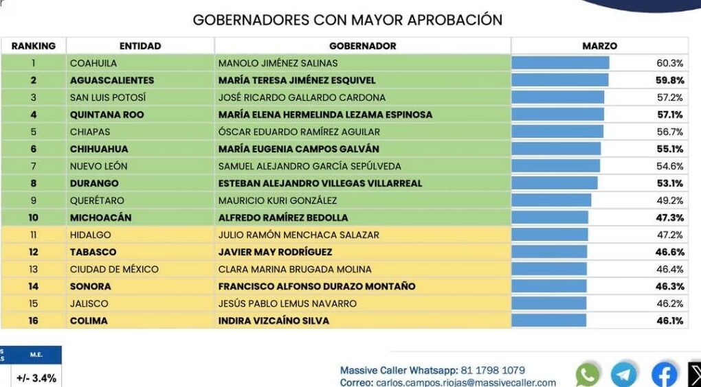 Redacción. La más reciente medición de Massive Caller, levantada el 26 de marzo de 2026, vuelve a colocar al gobernador de San Luis Potosí, Ricardo Gallardo Cardona, entre los mandatarios