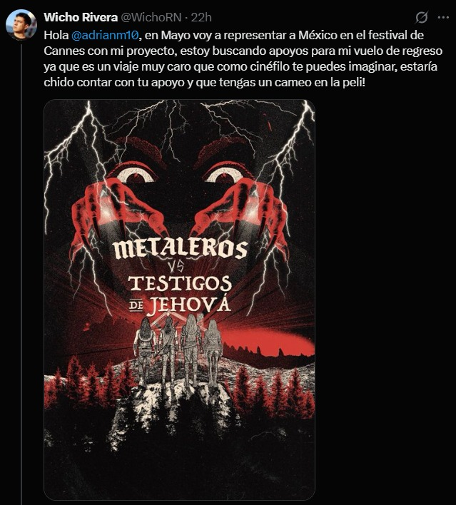 El director solicitó respaldo para cubrir los gastos de traslado, con el objetivo de representar a México con su proyecto cinematográfico Metaleros vs Testigos de Jehová.