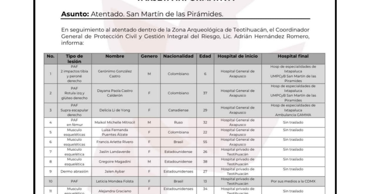 Autoridades dieron a conocer la identidad de las 13 personas que resultaron lesionadas durante el ataque ocurrido en la zona arqueológica de Teotihuacán, donde el saldo oficial se mantiene en dos personas fallecidas —una turista canadiense y el agresor—.