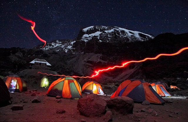Barranco camp por la noche, una de las bases para llegar a la cima del Monte Kilimanjaro, en Tanzania.