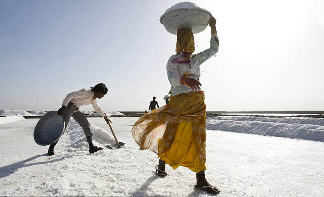 Mujer jornalera en Gujarat, India. Lugar desértico y hostil e donde se produce sal cruda.