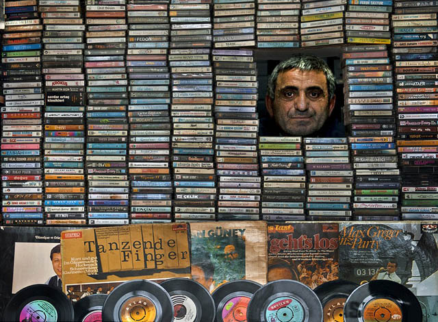 Él es Ahmet, quien tiene una pequeña tienda de discos.