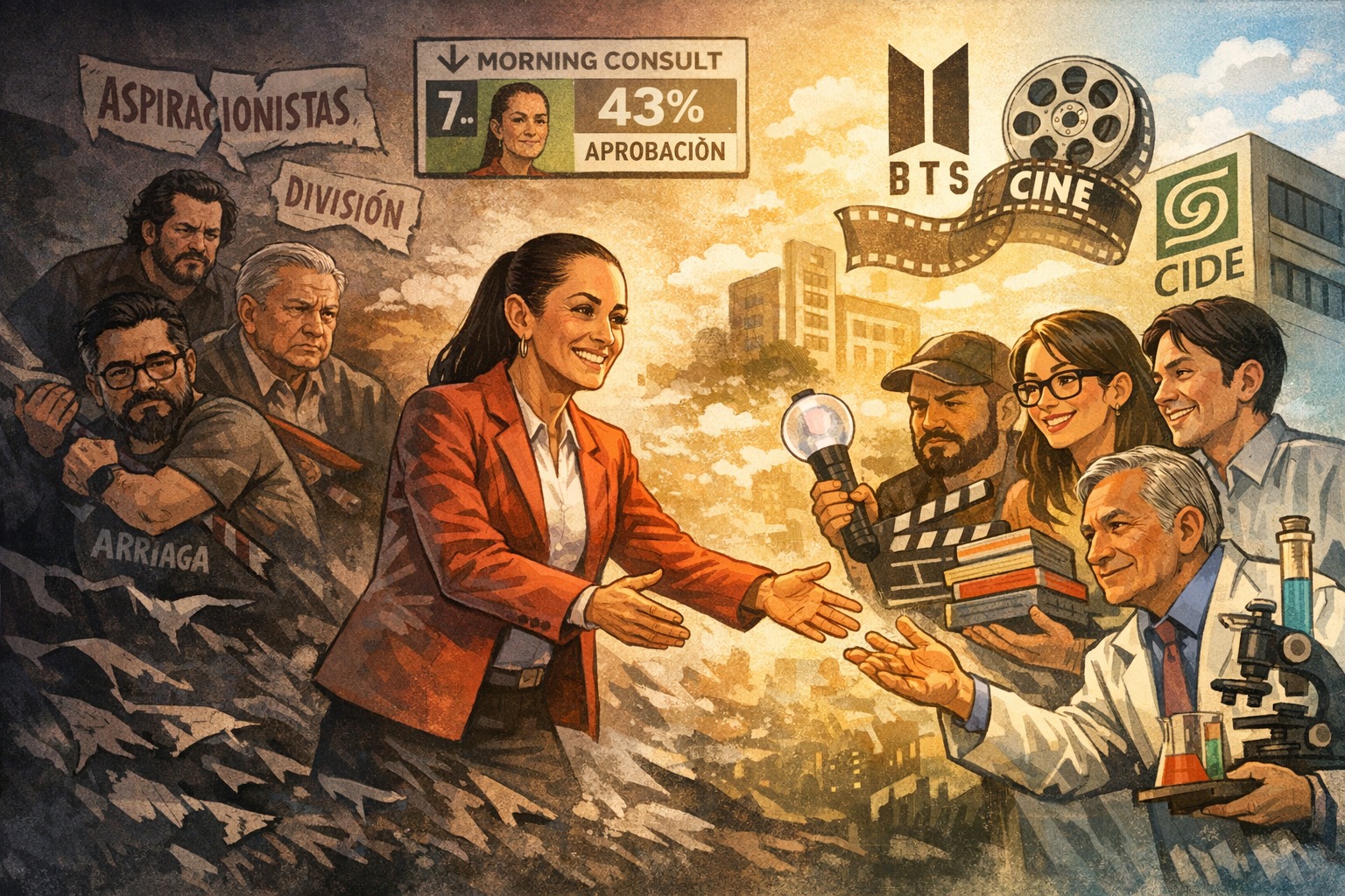 CINE Y BTS Por eso comienzan a aparecer señales que, observadas en conjunto, revelan un intento de reconciliación. El respaldo a la industria cinematográfica, un sector históricamente marginado por el obradorismo bajo la sospecha de pertenecer a una élite cultural adversa. La participación del Estado como facilitador y gestor de conciertos de la banda coreana de KPOP BTS, gestos que no responden a una urgencia social, sino a una necesidad simbólica: reconstruir el vínculo con una clase media urbana, profesional y culturalmente integrada al mundo. La moderación progresiva del discurso presidencial, menos confrontativo, menos beligerante, más orientado a la estabilidad que al conflicto. No es un cambio ideológico. Es una adaptación estratégica.