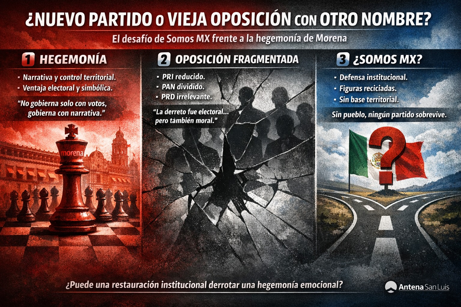 LA OPOSICIÓN La oposición mexicana decidió reinventarse justo cuando ya nadie cree en los partidos. Somos MX nace —o intenta nacer— en el momento más adverso posible: cuando el electorado no solo desconfía del gobierno, sino también de quienes dicen combatirlo. Y esa es la primera paradoja.