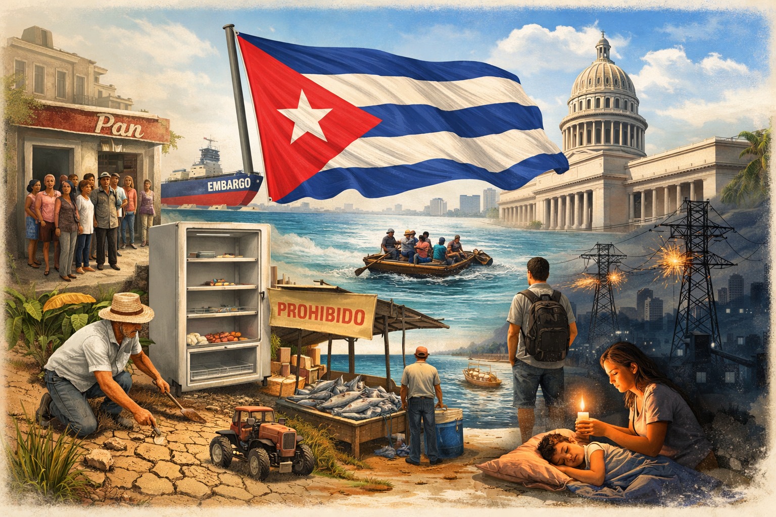 CUBA Cuba es hoy una de las paradojas más dolorosas del siglo XXI. Una isla rodeada de mar, con clima tropical, tierra fértil y una tradición agrícola que alguna vez alimentó a medio Caribe, hoy enfrenta apagones interminables, escasez de alimentos y una migración masiva que vacía pueblos enteros. No es una caricatura ideológica: es una crisis humana visible en las colas para comprar pan, en los hospitales sin medicamentos y en las balsas que siguen saliendo rumbo a Florida.