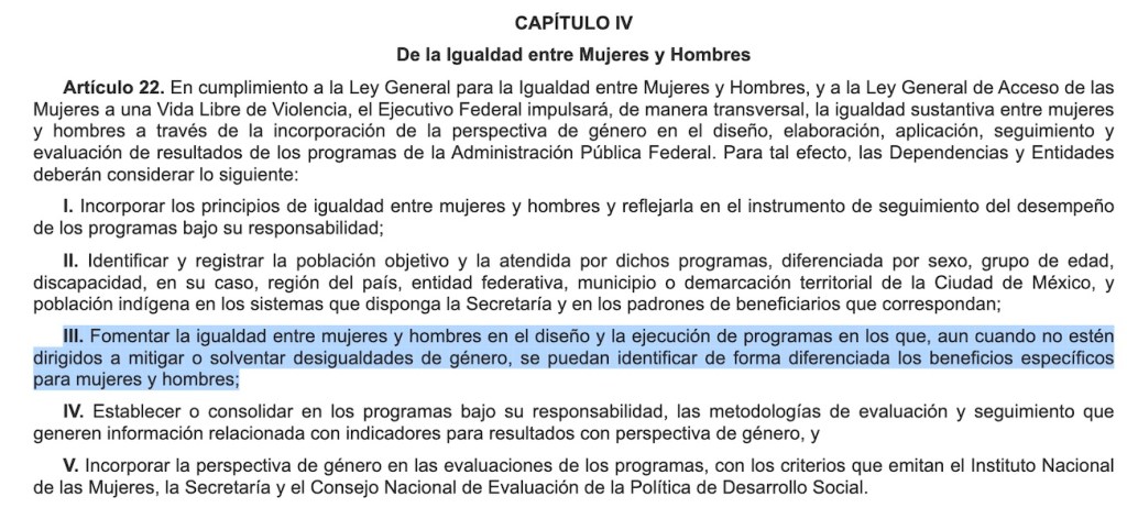 (Justo lo vemos en el caso del Presupuesto de Egresos 2023, donde el gobierno indica que no es necesario que todos los programas contenidos en el Anexo 13 estén directamente relacionados con la mitigación de las desigualdades entre hombres y mujeres, porque los mismos pueden ser diferenciados per se).